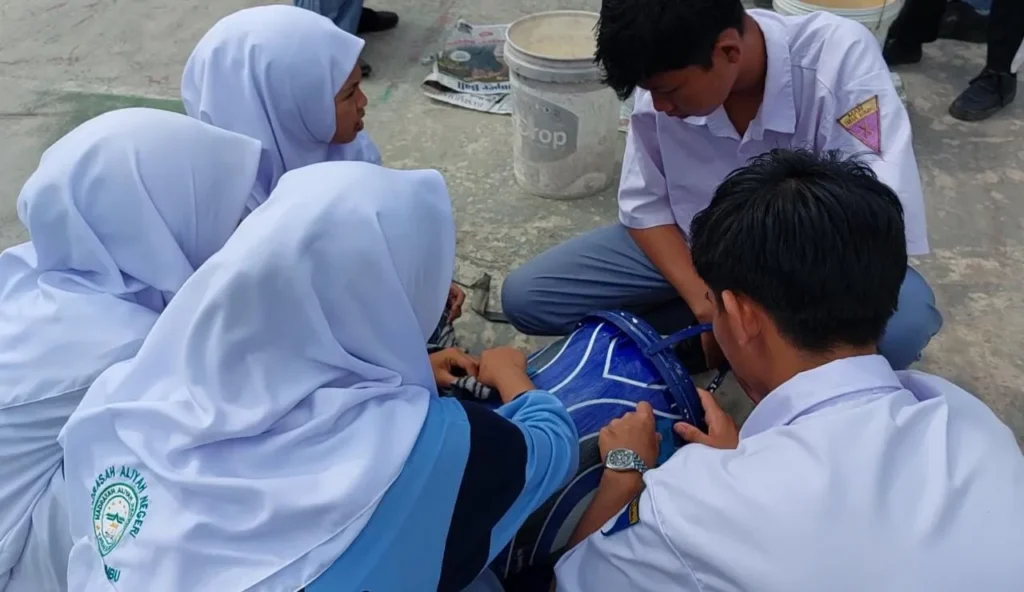 Pagatan (MAN Tanbu) – Siswa-siswi Madrasah Aliyah Negeri Tanah Bumbu (MAN Tanbu) mengolah barang bekas berupa ember cat menjadi tong sampah yang indah. Proyek ini